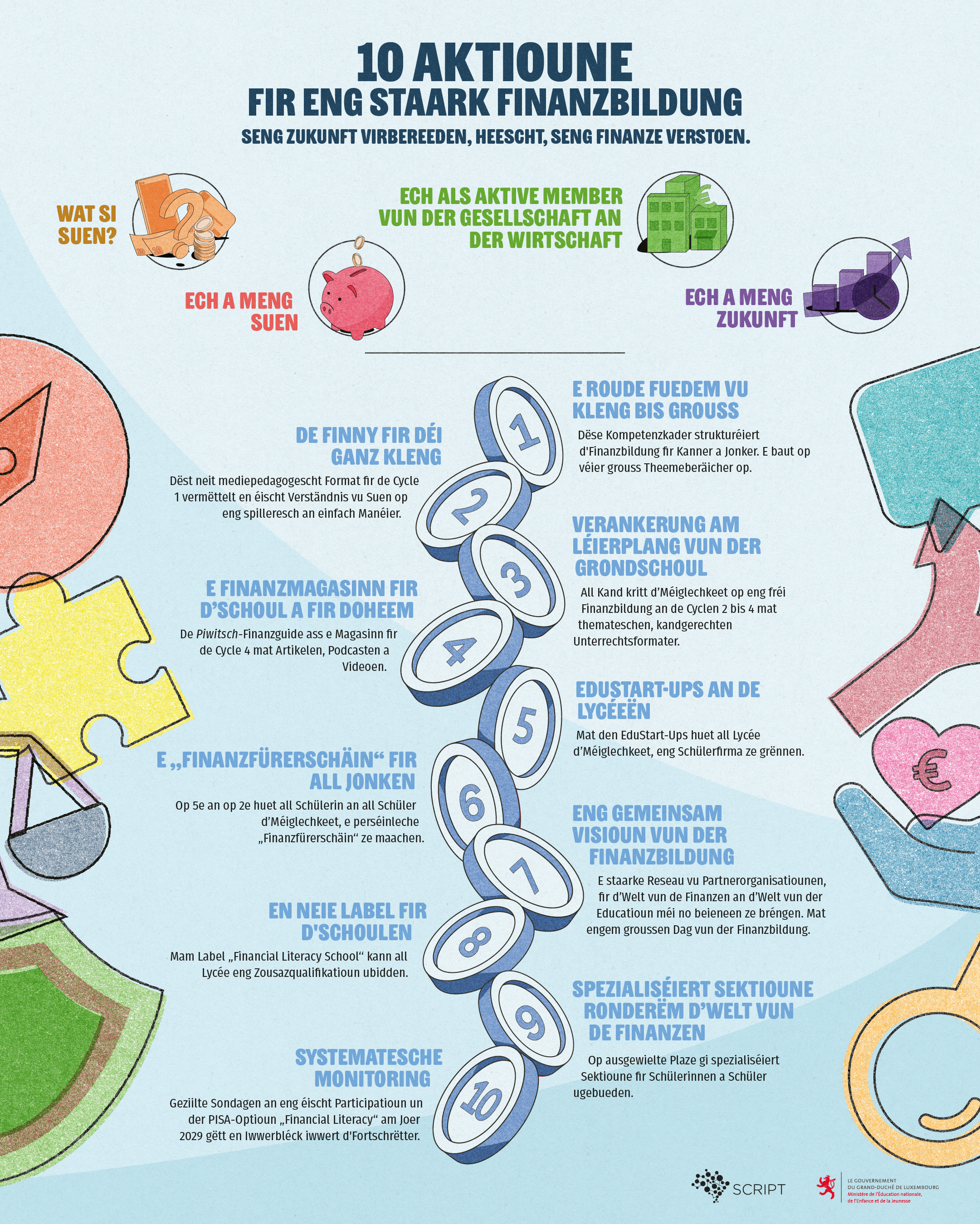 L'éducation financière occupe une place croissante dans les politiques européennes, notamment avec le Cadre européen de compétences financières pour les enfants et les jeunes élaboré conjointement par la Commission européenne et l'Organisation de coopération et de développement économiques (OCDE). Au Luxembourg, plusieurs initiatives dans ce domaine existent déjà, mais elles restent souvent ponctuelles.